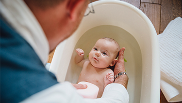Bathing your baby is about more than getting them clean. It’s a chance to play with and spend time with them – and it’s fun for both of you. Your newborn may take some time to get used to the idea of bath time and become distressed when all of their clothes are removed. This phase usually passes quite quickly.