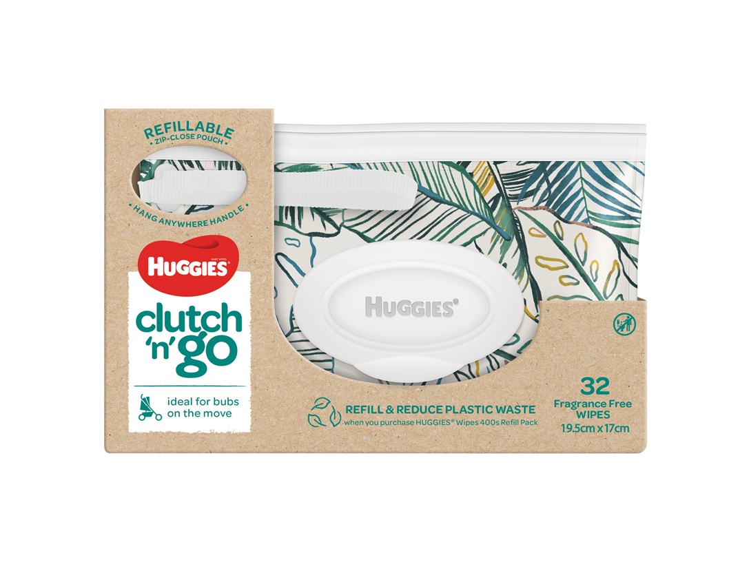 Huggies Refillable Baby Wipes Clutch 'N' Go, now with 4 different designs. Featuring a refillable zip-close pouch and a hang anywhere handle, Huggies Fragrance Free Clutch 'N' Go wipes are ideal for when you and bub are on-the-go.