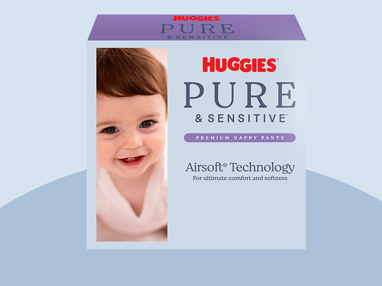 Experience gentle protection with every change with Huggies Pure and Sensitive premium nappy pants.