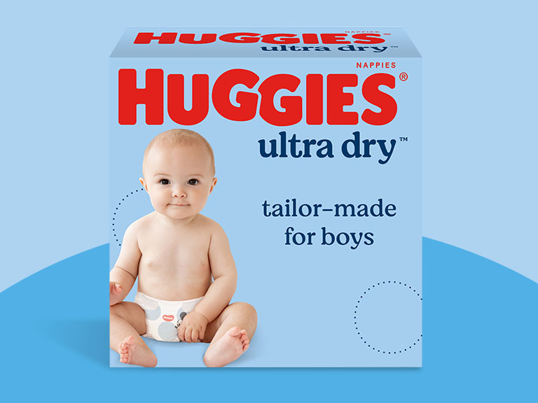 Huggies® Ultra Dry Nappies with tailor-made absorbency up front for boys. Huggies® unique Rapid-Dry™ Technology instantly absorbs wetness and springs back dry in seconds. Keeping baby snug & dry, day & night with up to 12hrs leakage protection.