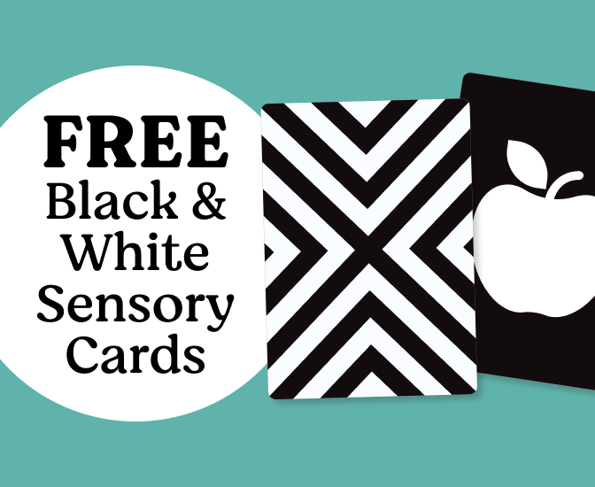 Use your high-contrast cards in a variety of ways - at the change table, during tummy time, turn into a book or use like flash cards. Print them and laminate for longevity.