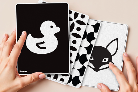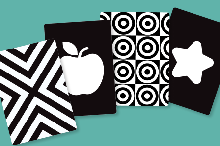 Black and white high contrast cards make it easier for newborn babies to focus, track and differentiate shapes and patterns. Using the cards with newborn babies helps encourage their visual development.